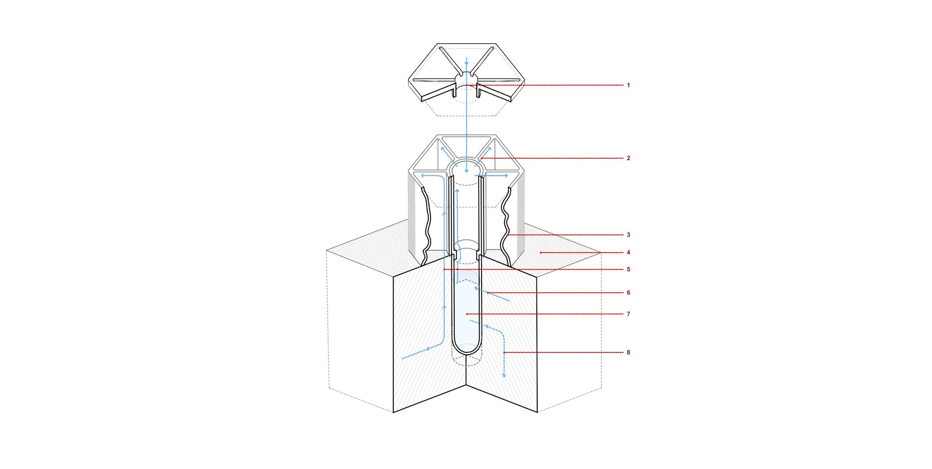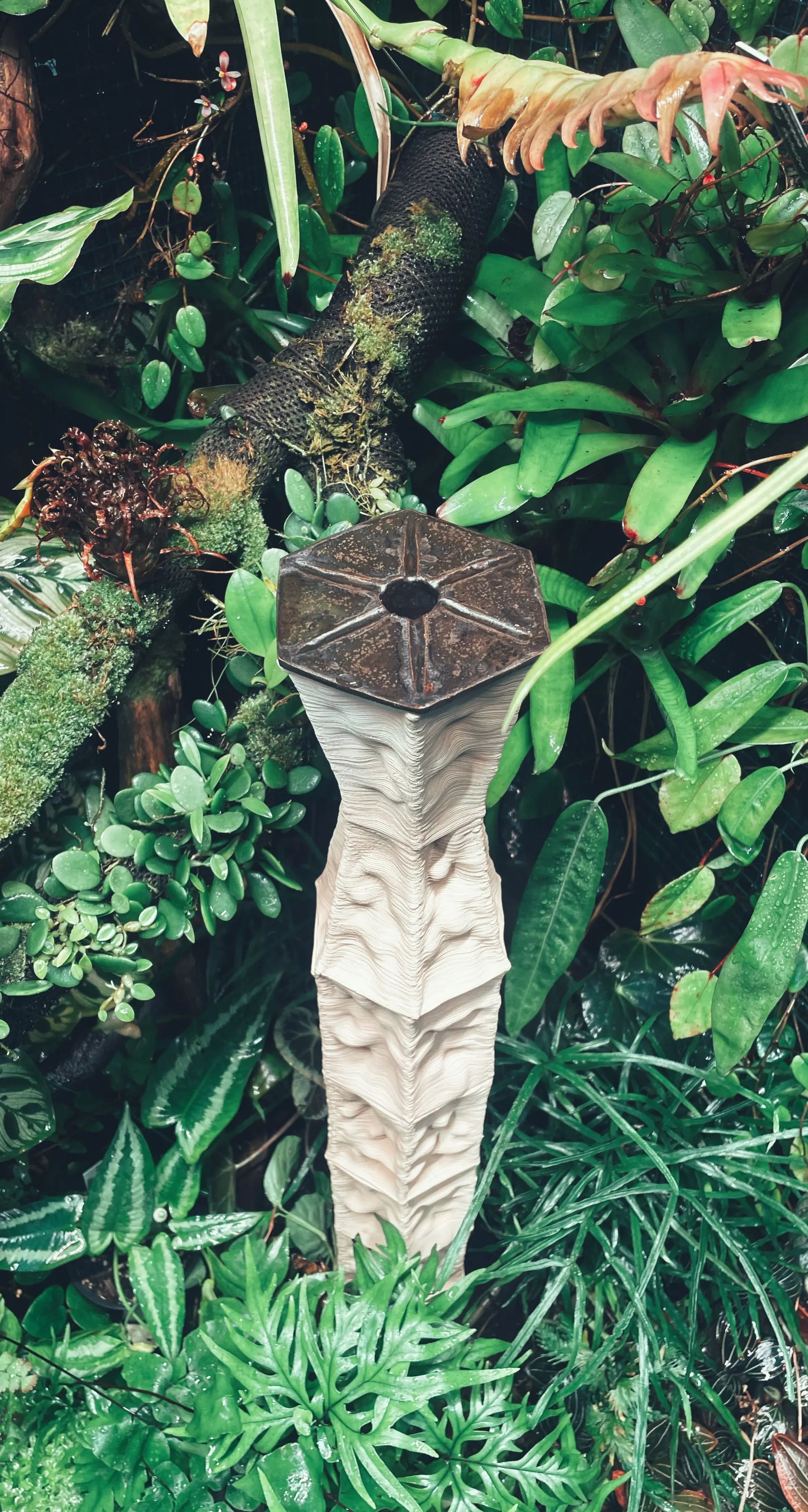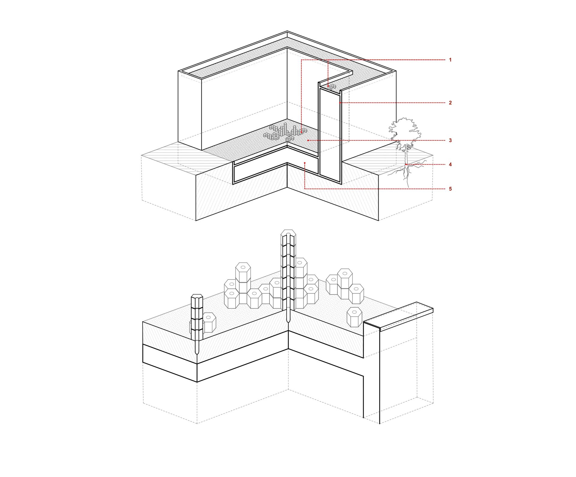 Proces projektowy rozpoczął się od serii skanów 3D wyselekcjonowanych drzew szczególnie bogatych w organizmy zasiedlające. Następnie przeprowadzono analizę morfologiczną struktur roślinnych, ze szczególnym uwzględnieniem kokornaka i wilczomlecza. Uzyskane dane posłużyły do opracowania zarówno zewnętrznej, jak i wewnętrznej struktury modułów instalacji drukowanych w technologii 3D z wysoko porowatej ceramiki. Każdy moduł posiada rdzeń magazynujący wodę opadową, zdolny również do kapilarnego poboru wilgoci z gruntu w okresach suszy. Promienisty, heksagonalny układ strukturalny pełni funkcję podkonstrukcji oraz systemu dystrybucji wilgoci do zewnętrznych powierzchni biologicznie aktywnych. Ich forma wynika bezpośrednio z analiz skanów drzew i została zoptymalizowana pod kątem łatwego zasiedlania przez organizmy.